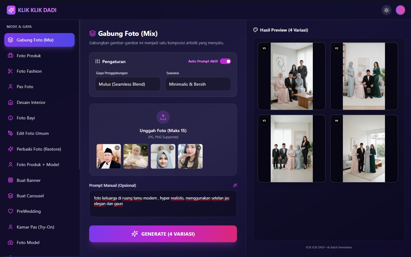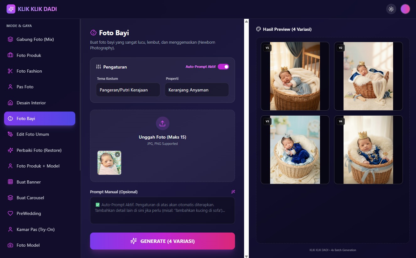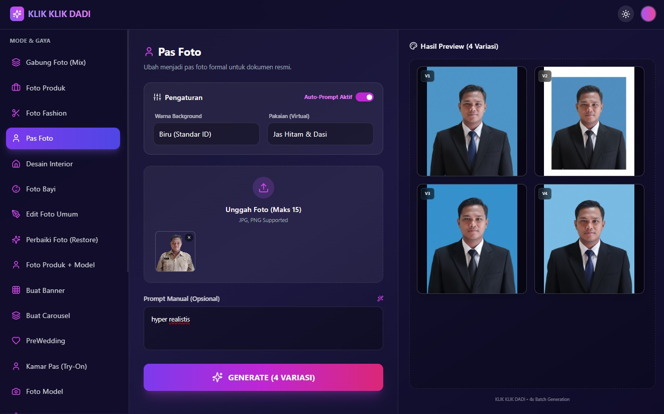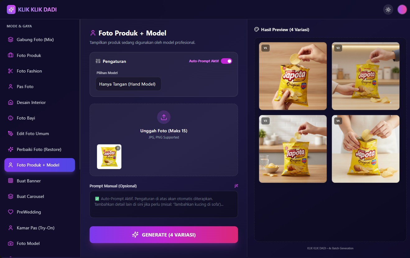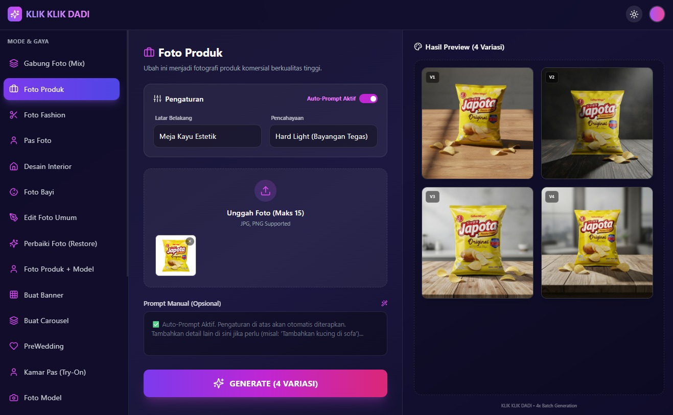 Cukup upload foto dan pilih fitur. Sistem kami sudah otomatis menggunakan prompt terbaik untuk hasil maksimal!