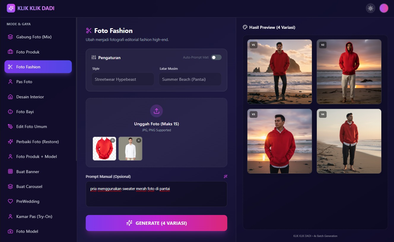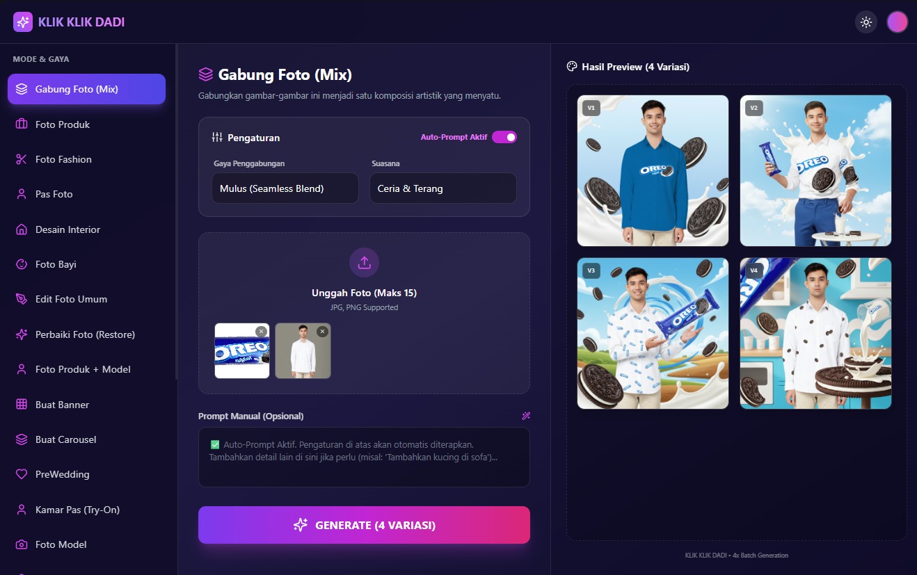 Dari foto produk, fashion, bayi, hingga karikatur - semua ada dalam satu platform. Tidak perlu langganan berbagai tool!